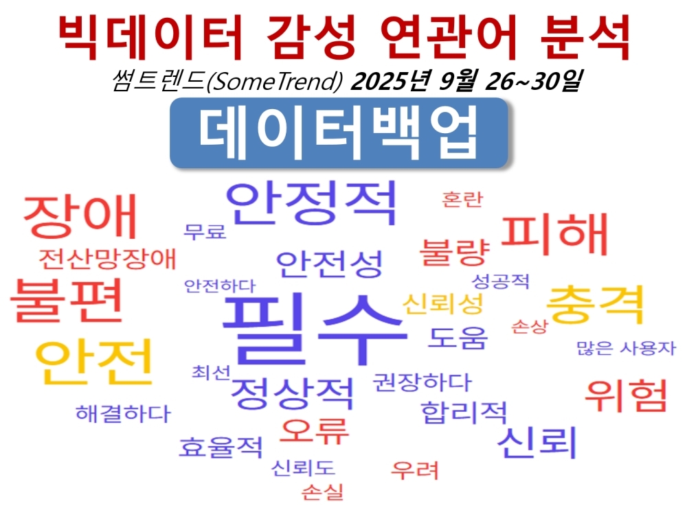 조선시대의 5대 사고(史庫)처럼 데이터 백업은 그 어느 시기보다 더 중요해지고 있다. 빅데이터는 데이터 백업에 대해 어떤 반응을 보일까. 빅데이터 심층 분석 도구인 썸트렌드(SomeTrend)로 지난 9월 26일부터 30일까지 데이터 백업에 대한 빅데이터 감성 연관어를 도출해 보았다. 데이터 백업에 대한 빅데이터 감성 연관어는 ‘필수’, ‘안전’, ‘불편’, ‘장애’, ‘안정적’, ‘피해’, ‘충격’, ‘위험’, ‘신뢰’, ‘정상적’, ‘안전성’, ‘불량’, ‘오류’, ‘도움’, ‘합리적’, ‘효율적’, ‘신뢰성’, ‘전산망장애’, ‘권장하다’, ‘우려’, ‘해결하다’, ‘무료’, ‘신뢰도’, ‘손실’, ‘혼란’, ‘성공적’, ‘최선’, ‘손상’, ‘많은사용자’, ‘안전하다’ 등으로 나왔다(위 그림).