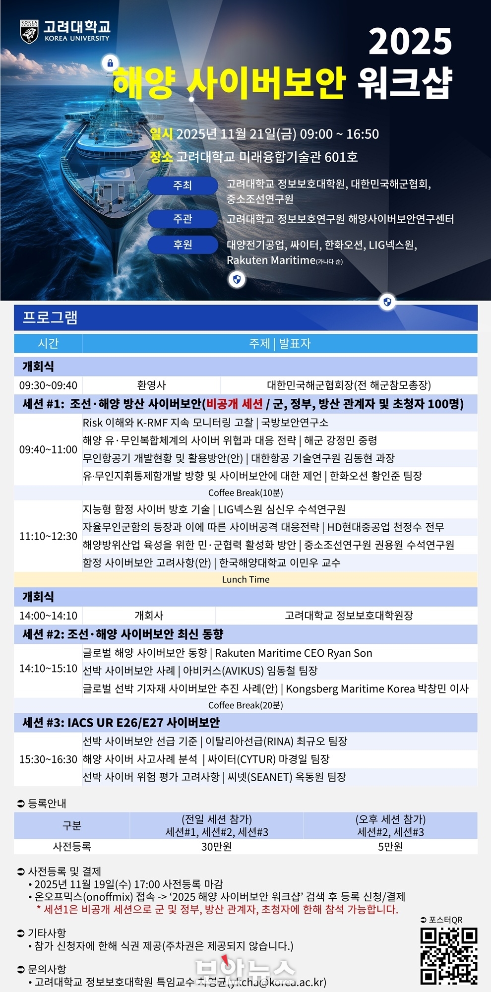 이번 행사는 고려대 정보보호대학원과 대한민국해군협회, 중소조선연구원이 공동 주최하고, 고려대 정보보호연구원 해양사이버보안연구센터가 주관하며, 대양전기공업, 싸이터, 한화오션, LIG넥스원, 라쿠텐 마리타임이 후원한다.