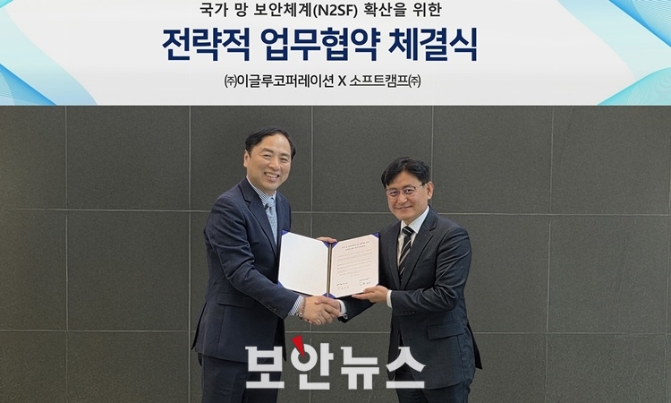 [보안뉴스 조재호 기자] 이글루코퍼레이션과 소프트캠프는 차세대 국가망 보안체계(N2SF) 전환을 지원하는 종합 보안 전략을 위해 상호 전략적 제휴(MOU)를 체결했다고 16일 밝혔다.