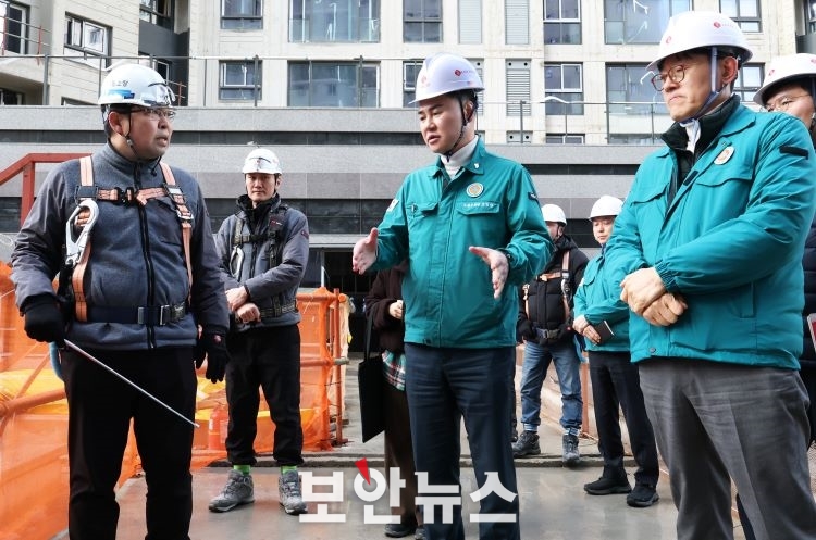 ▲오언석 도봉구청장(가운데)이 지역 대형공사장을 찾아 현장 관계자에게 근로자 안전관리 준수 등을 강조하고 있다 [자료: 도봉구]