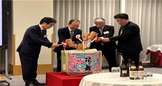 ▲김동희 KAIPS IP해외협력위원장(맨 왼쪽) 등 주요인사들이 기념식장에서 일본 전통 ‘술독 깨기’ 퍼포먼스를 하고 있다. [자료: KAIPS]