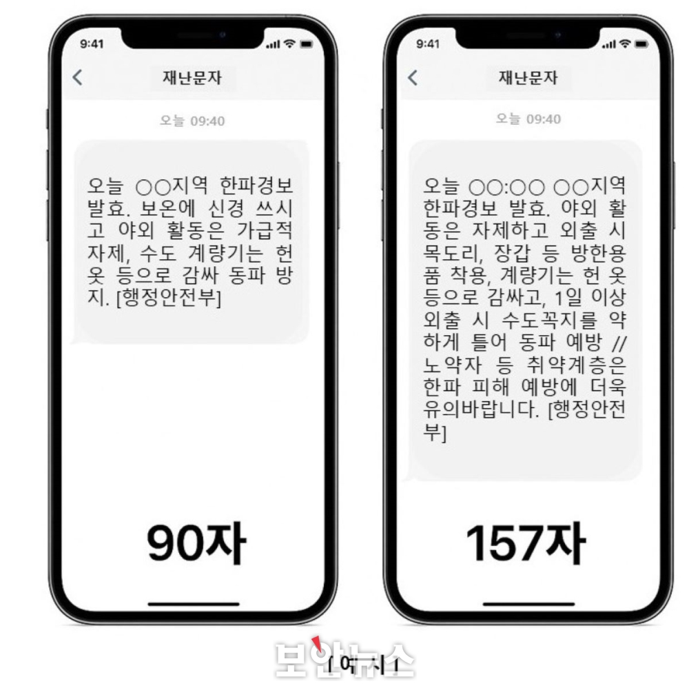 다만, 대피명령 등 긴급한 상황의 재난문자는 구형 휴대전화가 157자 수신이 불가능한 점을 고려해 기존 90자 체계를 유지한다.