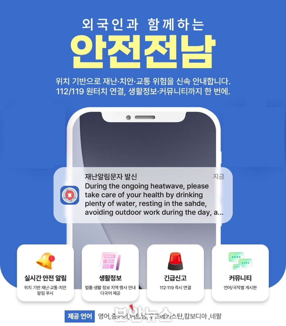[보안뉴스 강초희 기자] 전라남도자치경찰위원회(위원장 정순관)는 전남 체류 외국인의 안전 사각지대를 해소하고 언어 장벽에 따른 재난이나 범죄 대응의 어려움을 줄이기 위해 ‘다국어 안전전남’ 앱을 개발, 본격 서비스한다고 밝혔다.
