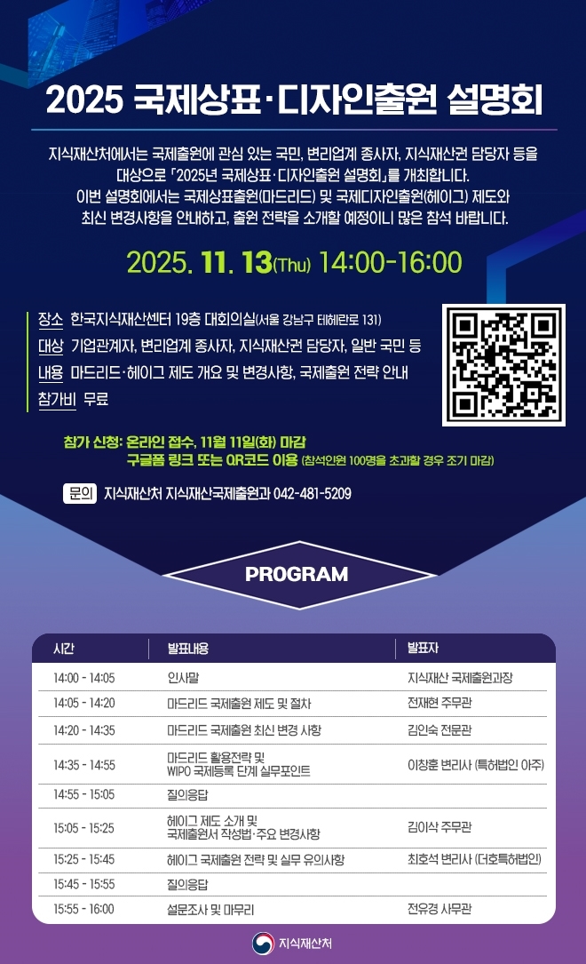 이번 설명회는 △마드리드·헤이그 국제출원을 활용한 해외상표·디자인 출원 전략 △국제출원 제도 및 절차 △최신 제도 변경사항 △질의응답 등의 내용으로 2시간 동안 진행될 예정이다.