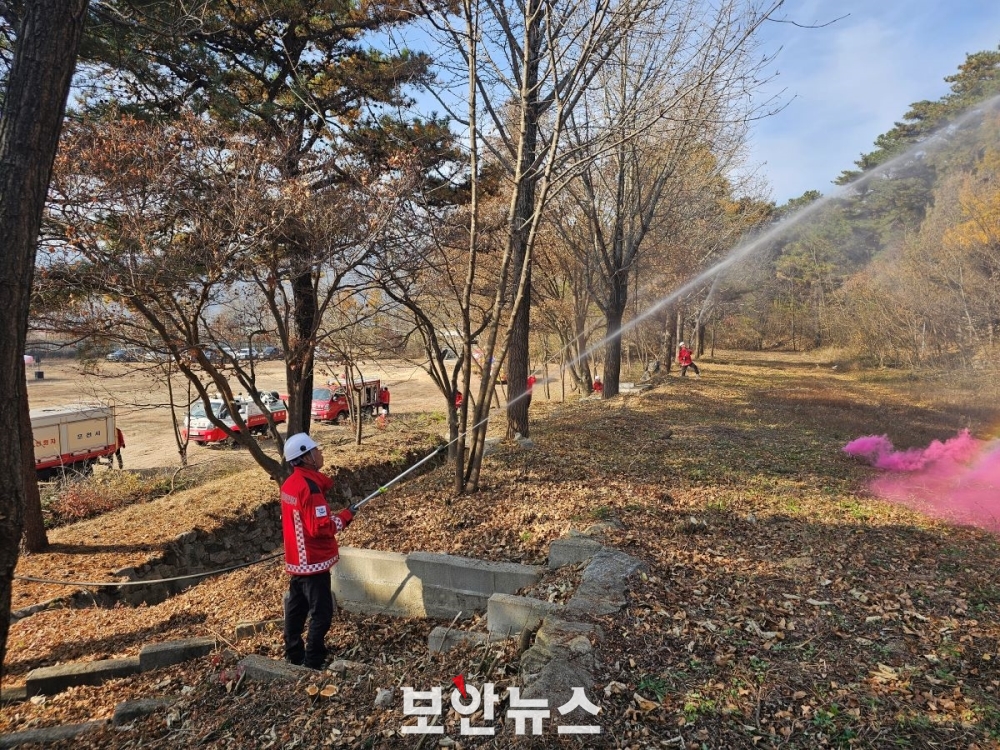지상에서는 산불진화차를 배치해 산불 초기 대응과 대형산불 차단을 위한 방어선 구축 등에 집중했으며, 공중에서는 산불임차 헬기 1대와 드론을 활용한 소화탄을 시연해 산불 현장의 공중 지원 능력을 높이는 훈련을 진행했다.