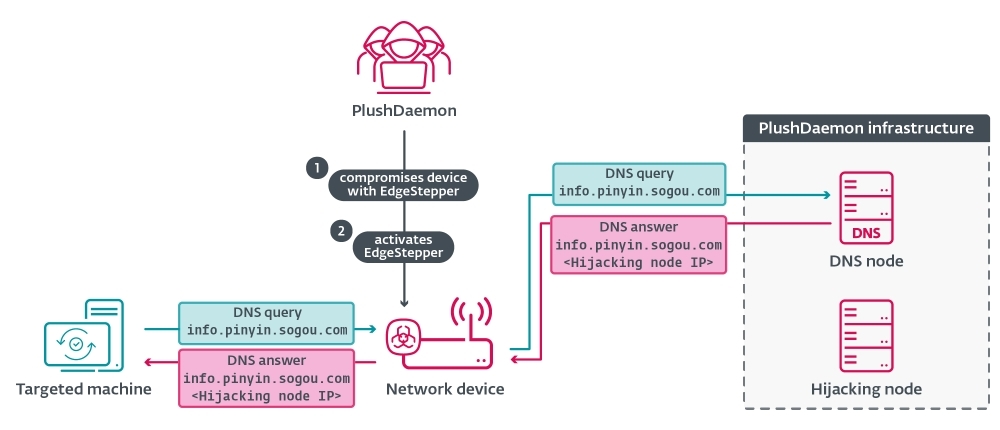 공격자가 취약점 악용이나 취약한 자격 증명을 통해 라우터 같은 네트워크 장치를 침해하면, 에지스텝퍼가 DNS 트래픽을 가로채기 시작한다. 사용자가 중국어 입력 소프트웨어 ‘수구 핀인(Sogou Pinyin)’ 등 중국어 관련 소프트웨어를 업데이트하려고 할 때, 이 악성코드는 연결을 공격자가 통제하는 서버로 리디렉션한다. 이 하이재킹 노드는 이후 정상 소프트웨어에게 진짜 업데이트 파일 대신 악성 DLL 파일을 다운로드하도록 지시한다.