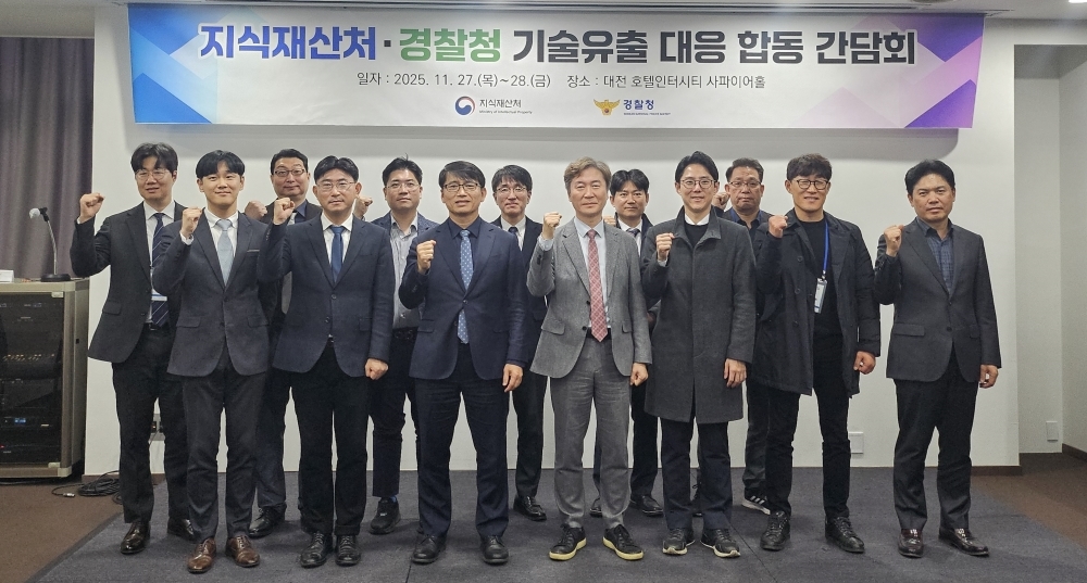 지식재산처는 27일 오후 대전 유성구 호텔인터시티에서 ‘지식재산처‧경찰청 기술유출 대응 합동간담회’를 개최했다고 이날 밝혔다. 행사는 기술보호 핵심기관인 지재처와 경찰청간 업무 이해도 제고 및 협력 강화를 통해 기술유출 사건에 대한 공조체계를 견고히 하고, 범정부 차원 기술유출 대응 역량을 향상시키기 위해 마련됐다. 신상곤 지재처 지식재산보호협력국장(앞줄 왼쪽 3번째)이 간담회를 마치고 참석자들과 기념 촬영하고 있다. [자료: 지재처]