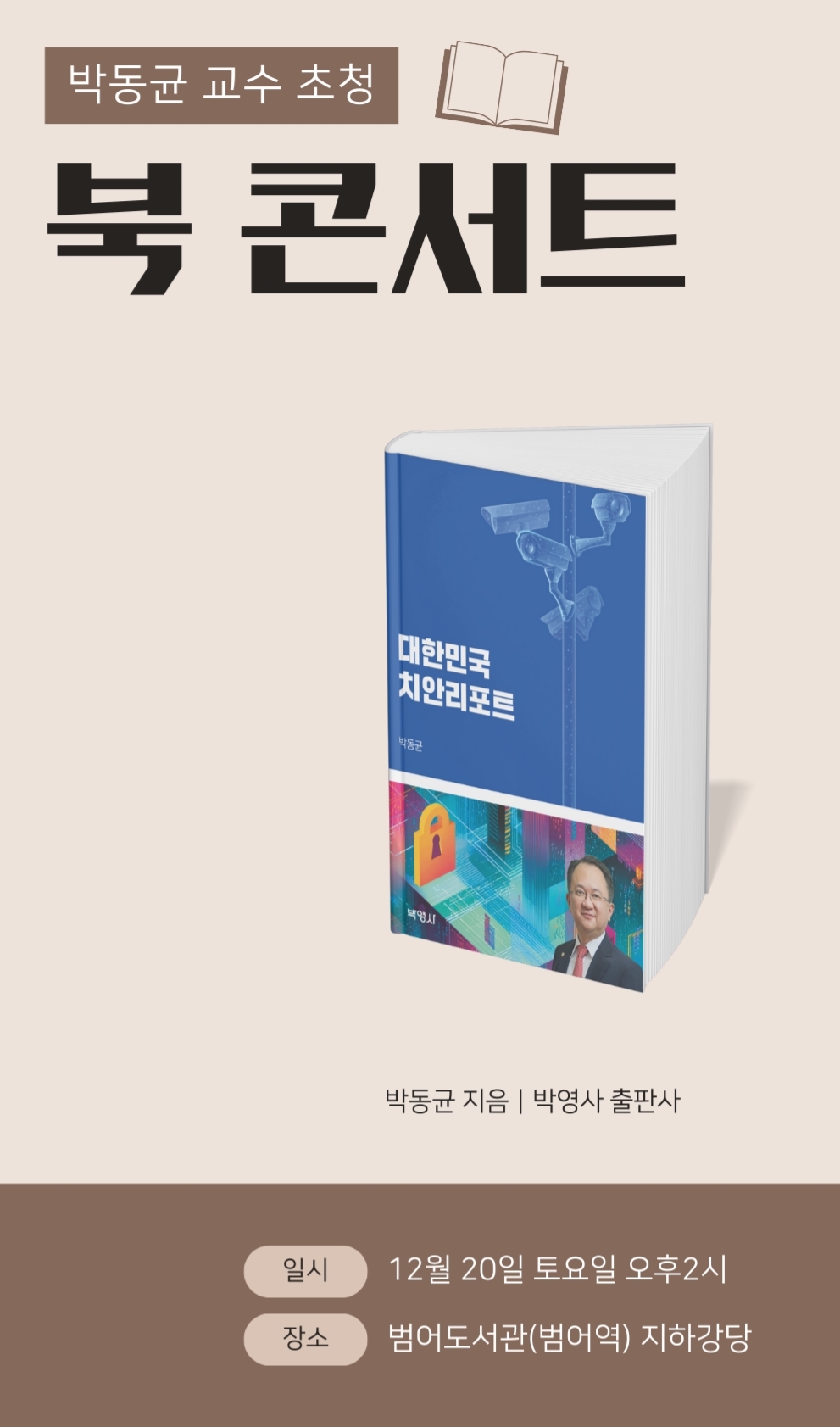 박동균 교수는 한국치안행정학회장, 한국경찰연구학회장을 역임했으며, 제1기 대구시 자치경찰위원회 상임위원 및 사무국장으로 활동한 국내 대표 치안·경찰행정 전문가다. 이번 행사는 박 교수가 출간을 앞둔 신간 ‘대한민국 치안리포트’(박영사) 주요 내용과 집필 배경을 독자들과 나누는 자리다.