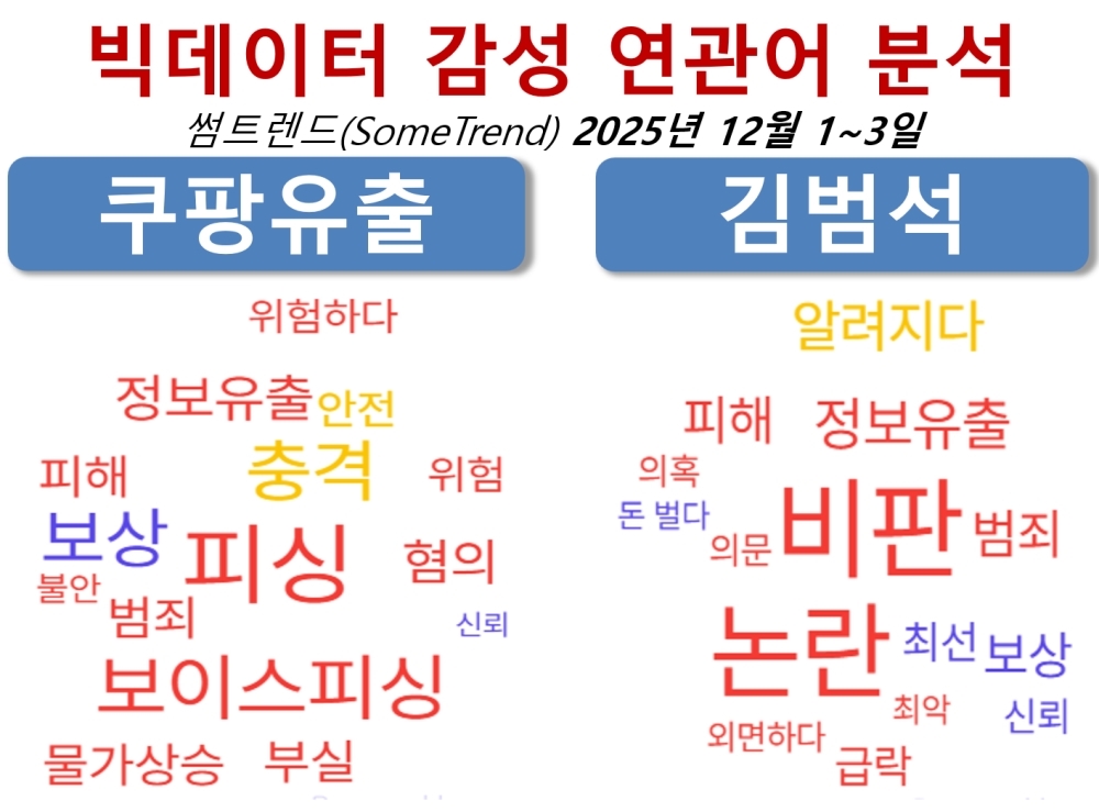 그렇다면 빅데이터는 쿠팡의 개인정보 유출과 김범석 쿠팡 의장에 대해 어떤 반응을 보일까. 빅데이터 심층 분석 도구인 썸트렌드(SomeTrend)로 지난 12월 1일부터 3일까지 쿠팡 유출과 김범석에 대한 빅데이터 감성 연관어를 도출해 보았다.