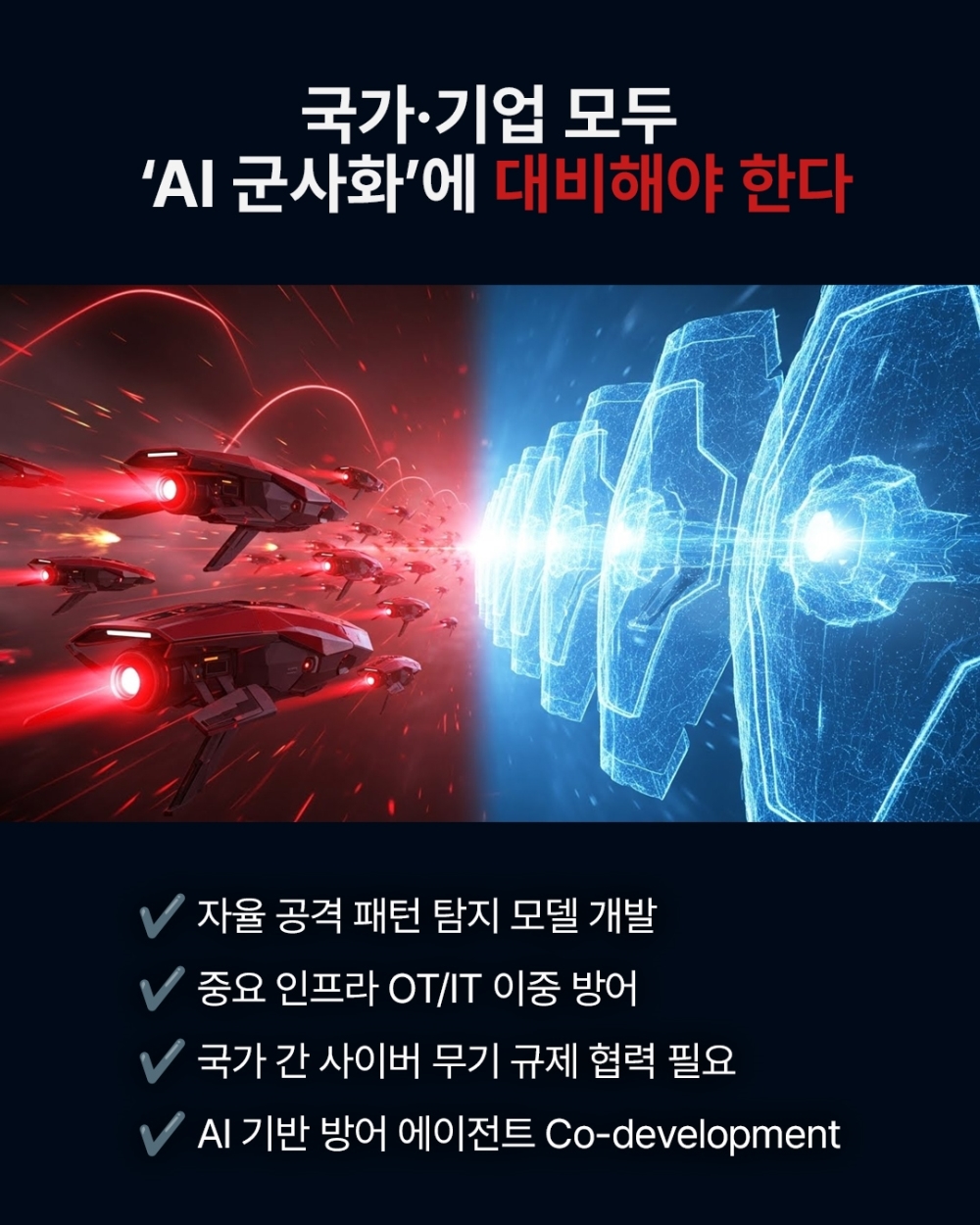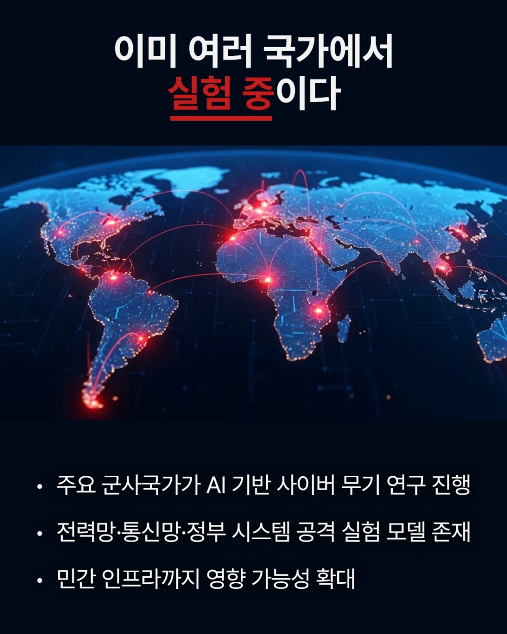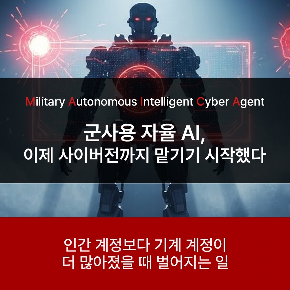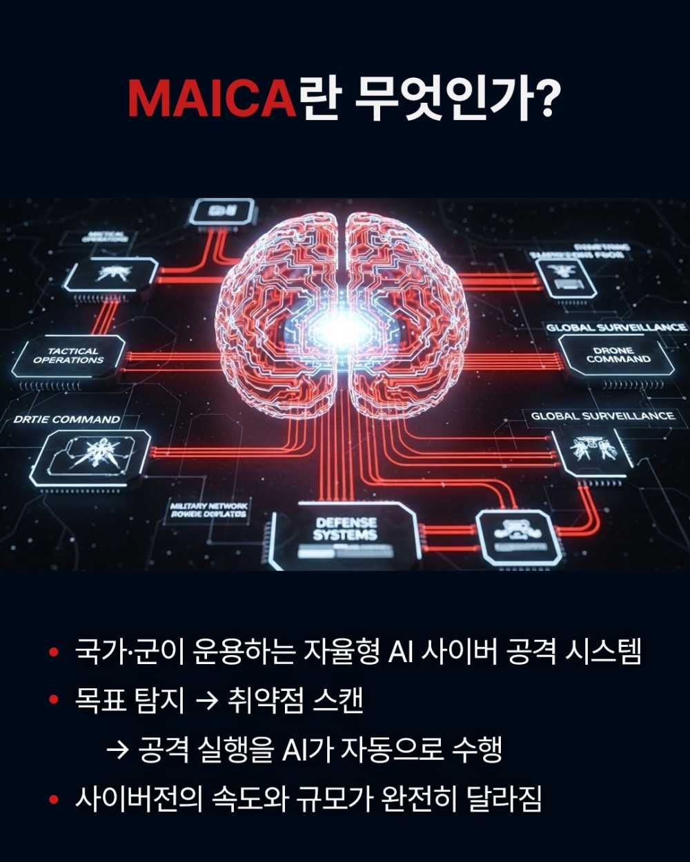 주요 군사 강국들이 AI를 이용해 사이버 무기화 실험을 진행 중이며, 전력망·통신망 등 핵심 인프라가 주요 공격 대상이 되고 있다. MAICA(Military Autonomous Intelligent Cyber Agent)는 목표 탐지와 취약점 스캔, 공격 수행까지 AI가 자율적으로 실행하는 시스템이다. 전문가들은 AI 기반 방어 모델 개발과 국가 간 AI 사이버 무기 규제 협력이 시급하다고 경고한다.