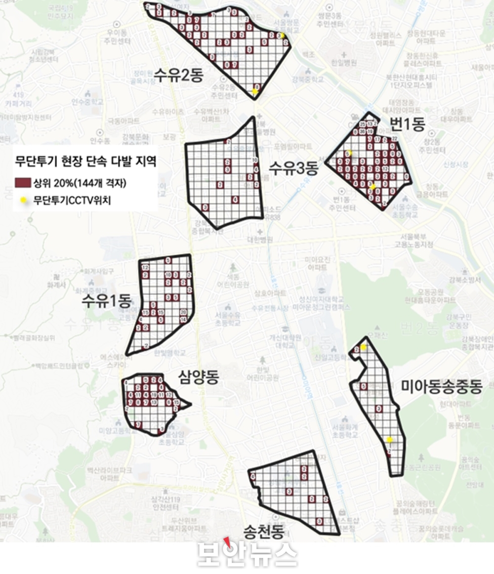 분석 대상은 번1동, 미아·송중동, 수유2동, 삼양동, 송천동, 수유1동, 수유3동 총 7개 지역이다. 분석팀은 해당 구역의 생활인구·취약계층 분포, 민원, 조도, 건축물 밀도 등 11종의 생활환경 데이터를 분석해 무단투기 단속용 CCTV, 보안등, 비상안심벨 등 인프라 우선 설치지역을 도출했다.