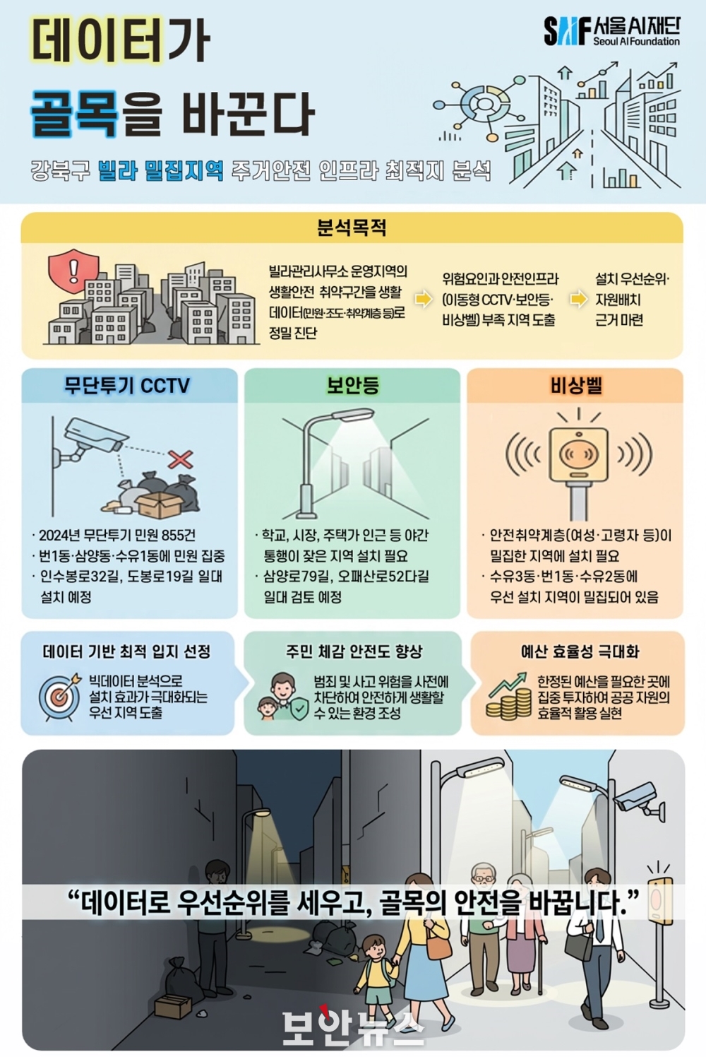 [보안뉴스 강초희 기자] 서울AI재단(이사장 김만기)은 강북구 빌라관리사무소 운영 지역을 대상으로 생활환경 데이터 분석을 통해, 골목길 안전·청결 수준을 높이기 위한 인프라 시설 설치 우선지역을 도출했다고 10일 밝혔다.