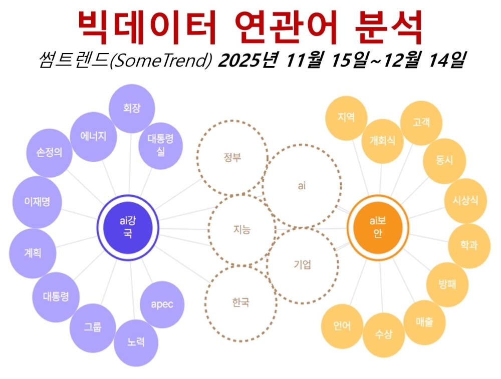 그렇다면 빅데이터는 AI 보안에 대해 어떤 인식을 가지고 있을까. 빅데이터 심층 분석 도구인 썸트렌드(SomeTrend)로 지난 11월 15일부터 12월 14일까지 AI 강국과 AI 보안에 대한 빅데이터 연관어를 도출해 보았다. 먼저 AI 강국에 대한 빅데이터 연관어는 ‘AI’, ‘정부’, ‘한국’, ‘지능’, ‘인공지능’, ‘기업’, ‘대한민국’, ‘산업’, ‘미국’, ‘강화’, ‘전략’, ‘인프라’, ‘정책’, ‘경제’, ‘엔비디아’ 등으로 나왔다.