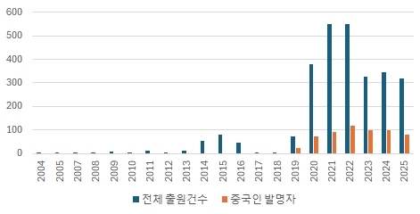 ▲전세계 쿠팡 특허 출원건과 중국인 발명자 추이 [자료: 리서치올]