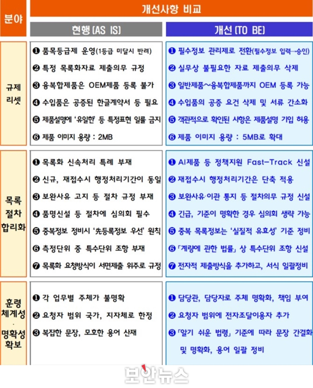 또한 규격서 등 특정 목록화 자료를 의무적으로 제출하도록 한 규정을 삭제해 기업이 목록정보에 반영하고 싶은 내용을 뒷받침하는 자료만 선택적으로 제출할 수 있도록 했다. 이밖에 융복합제품의 OEM 등록을 허용하고, 수입품 등록 시 서류 공증 의무도 없앴다.