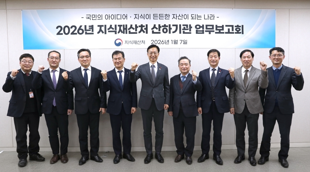 지식재산처는 7일 정부대전청사 소회의실에서 ‘2026년 지식재산처 산하기관 업무보고회’를 개최했다. 이번 보고회는 한국발명진흥회 등 각 기관별 올해 주요 업무계획과 상세 이행계획을 점검하고, 기관별 현안 및 대응방안을 공유하기 위해 열렸다. 김용선 지식재산처장(정중앙)이 참석자들과 기념촬영하고 있다. [자료: 지재처]