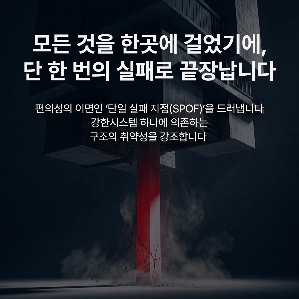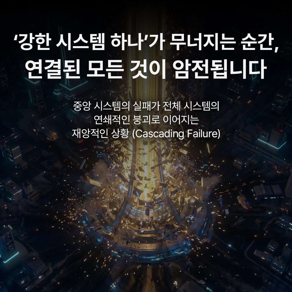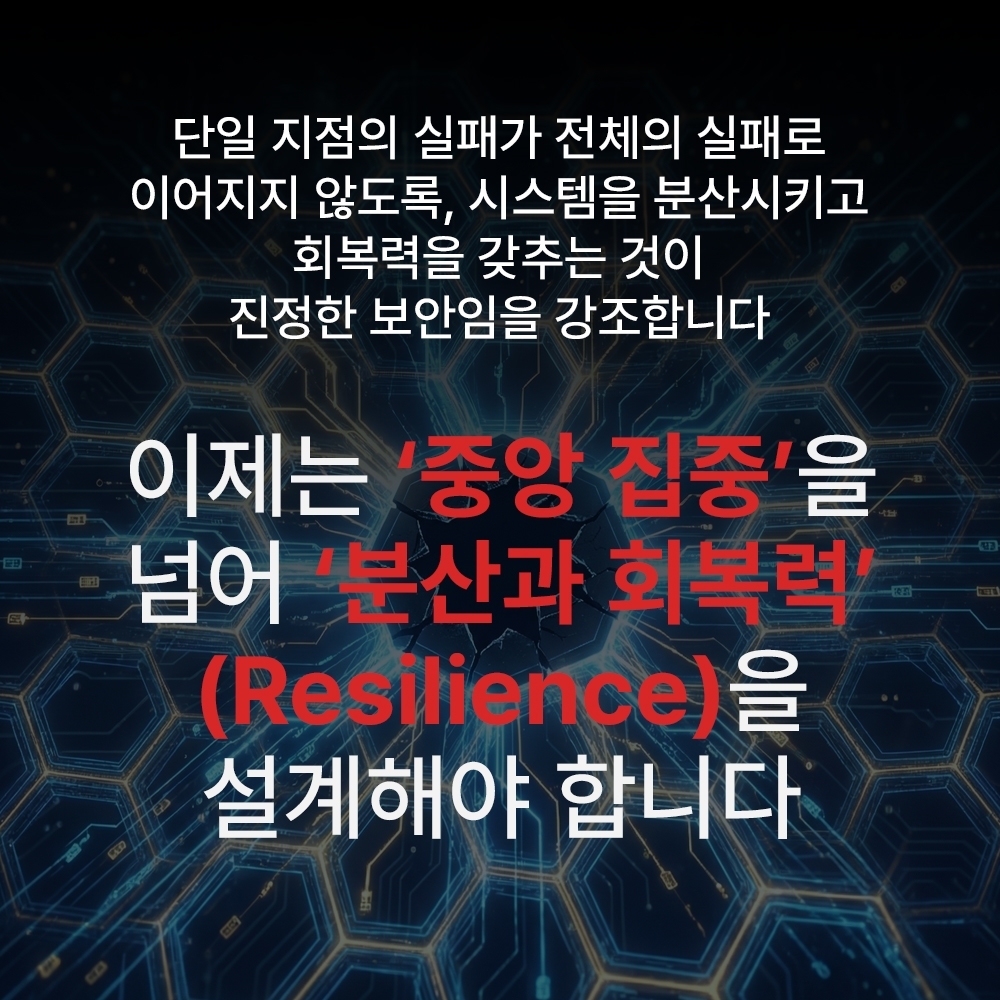 편의와 효율을 위해 구축한 ‘중앙 집중형’ 보안 시스템은 역설적으로 모든 위험이 한곳에 쏠리는 ‘단일 실패 지점(SPOF)’을 만들어낸다. 이로 인해 강력했던 중앙 시스템 하나가 뚫리거나 오작동할 경우, 연결된 전체 인프라가 연쇄적으로 붕괴(Cascading Failure)하는 재앙적 상황이 발생한다. 따라서 미래의 보안은 단순한 방어를 넘어, 시스템을 분산시키고 실패 시에도 빠르게 기능을 복구하는 ‘회복력(Resilience)’ 중심의 설계로 전환해야 한다.