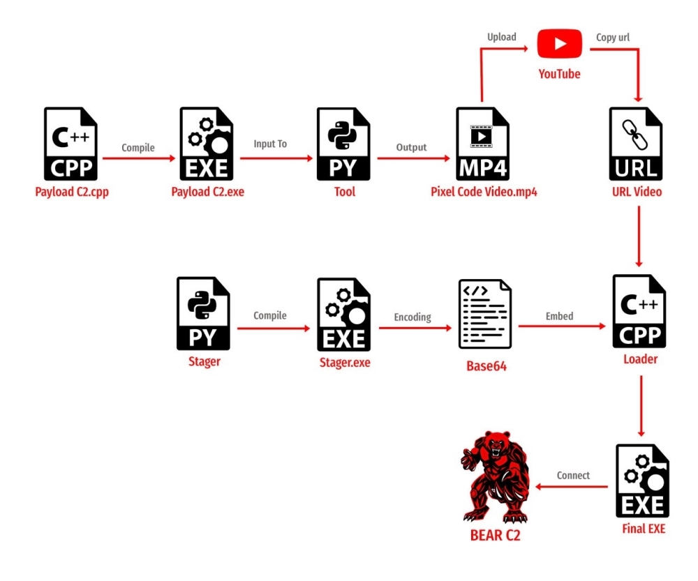 연구진은 특정 영상 URL이 포함된 커스텀 로더를 유포했다. 이 로더 내부엔 영상 데이터에서 악성 바이너리를 추출하기 위한 파이썬 스테이저가 완벽하게 원본 그대로 심겨 있었다. 로더가 실행되면 유튜브에서 영상을 다운로드한 뒤, 프레임별로 픽셀 데이터를 분석해 원래의 바이너리 파일을 복구하는 과정을 거친다.