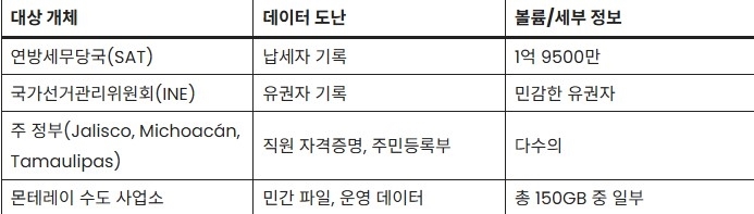 피해 규모도 상당하다. 멕시코 연방 국세청(SAT)에서 약 1억9500만건의 납세자 기록이 유출된 것으로 추정된다. 또 선거관리기구(INE)의 유권자 데이터와 여러 주 정부의 공무원 자격 증명 등 총 150GB 규모의 민감 정보가 외부로 유출됐다는 주장도 제기됐다.
