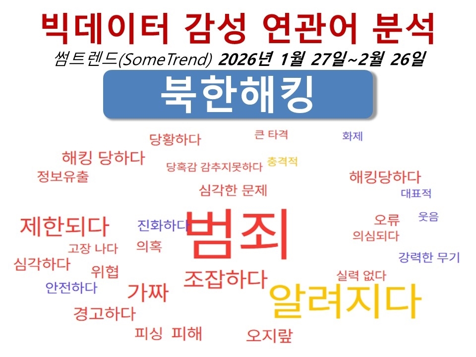 최근 빅데이터 분석을 통해 나타난 북한 해킹에 대한 대중의 인식은 사뭇 다르면서도 의미심장하다. 썸트렌드(SomeTrend)의 분석 결과(1월 27일~2월 26일)에 따르면, 북한 해킹과 연관된 가장 거대한 키워드는 범죄였다.