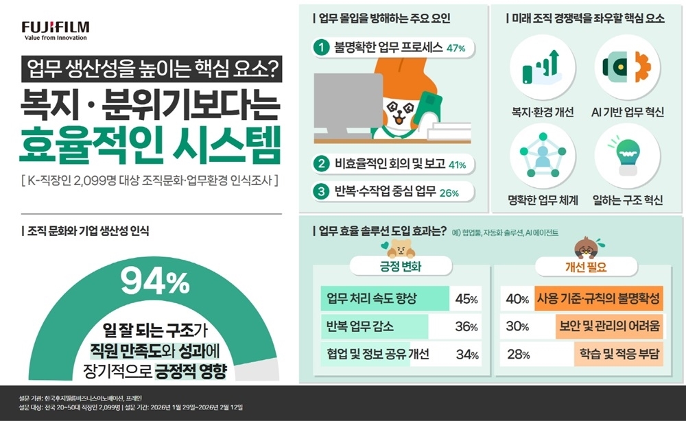 [보안뉴스 강초희 기자] 한국후지필름비즈니스이노베이션(대표 하토가이 준, 한국후지필름BI)이 1월 29일부터 2월 12일까지 2050세대 직장인 2099명을 대상으로 실시한 ‘K-직장인 조직문화·업무 환경 인식 조사’ 결과를 발표했다. 이번 조사는 조직문화가 업무 생산성과 기업 경쟁력에 미치는 영향과 향후 업무 환경 혁신의 주요 과제를 파악하기 위해 진행됐다.