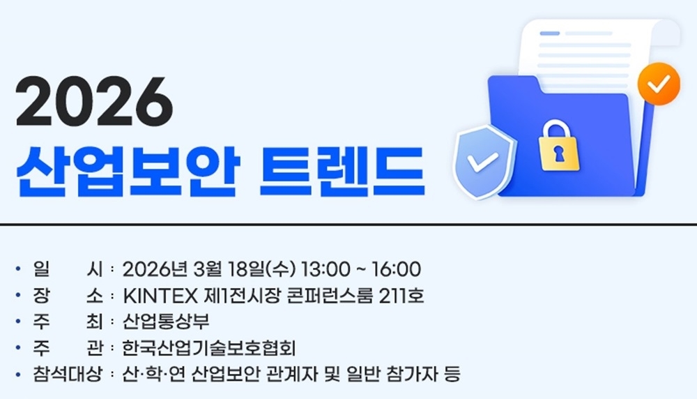 [보안뉴스 엄호식 기자] 산업통상자원부가 주최하고 한국산업기술보호협회가 주관하는 ‘2026 산업보안 트렌드’ 콘퍼런스가 3월 18일 일산 킨텍스 제1전시장 콘퍼런스룸 211호에서 열린다.