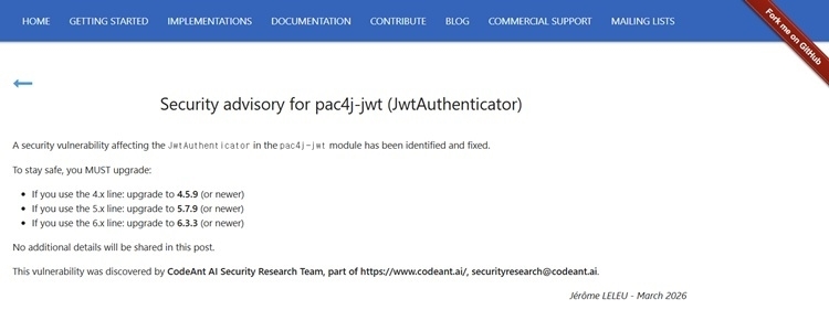 ▲pac4j의 공식 보안 권고문 [출처:pac4j 공식 홈페이지]