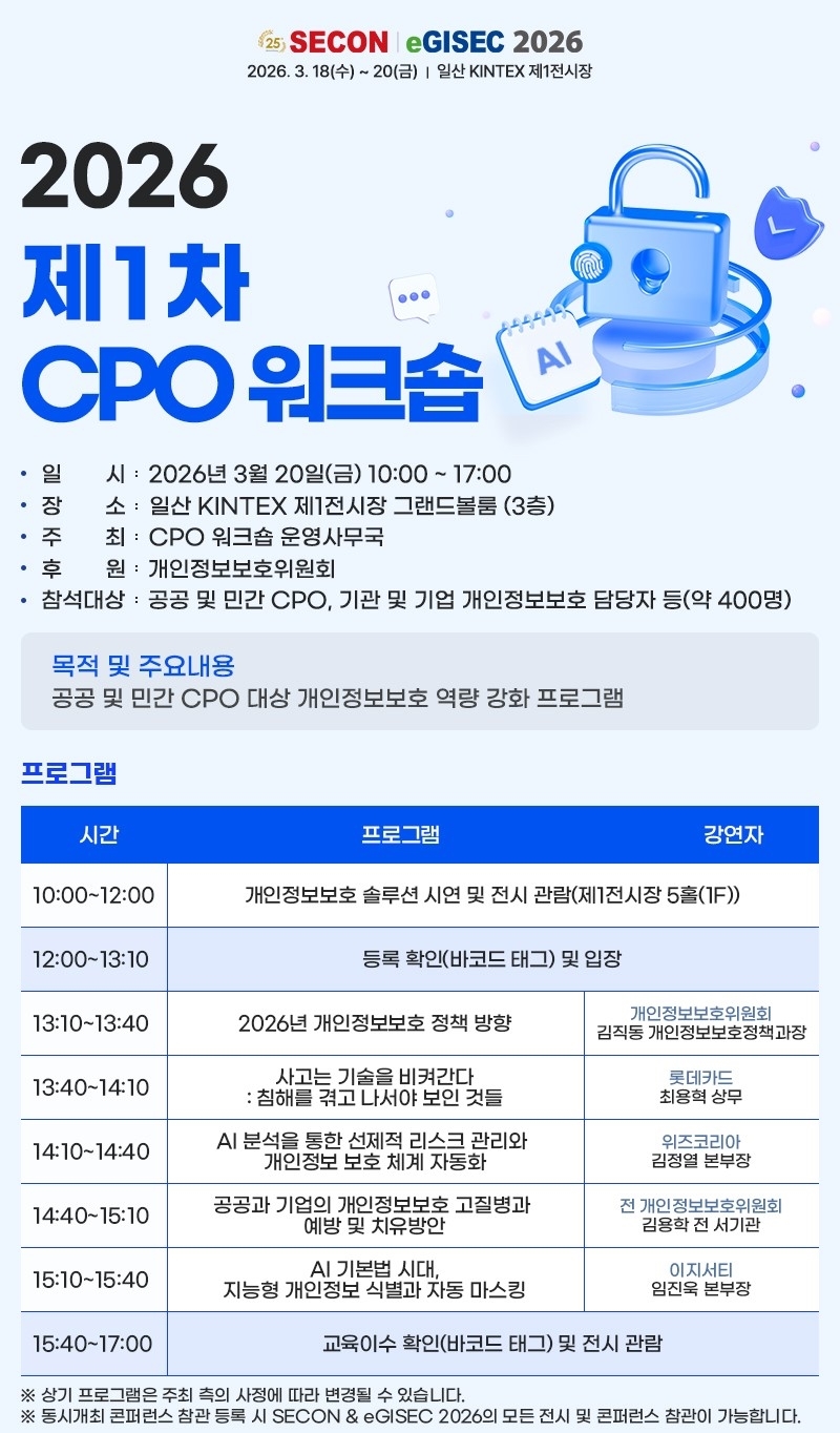 ‘2026년 제1회 CPO 워크숍’은 공공 및 민간 CPO, 기관 기업 개인정보보호 담당자들이 대상이다. 개인정보보호 정책 방향부터 기업 사례, AI 시대 개인정보보호 기술 등을 공유한다.