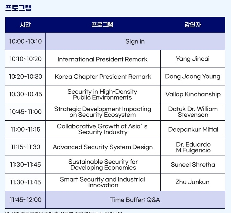 행사엔 양진카이 APSA 회장과 동중영 APSA 코리아 챕터 회장 등 국내외 전문가들이 참여한다. 발롭 킨찬쉽 APSA 태국 챕터 대표가 ‘고밀도 공중 환경의 보안’을 주제로, 윌리엄 스티븐슨 스파이포스 CEO는 ‘보안 생태계에 영향을 미치는 최근 주요 진전’을 주제로 발표한다. 또 아시아 지역 협력과 개발도상국을 위한 지속가능한 보안 등의 주제가 논의된다.