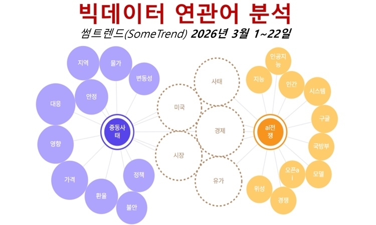 ‘썸트렌드’(SomeTrend)의 지난 3월 1일부터 22일까지 빅데이터 연관어 분석을 통해 ‘AI 전쟁’과 연관된 ‘시스템’, ‘모델’, ‘지능’이라는 키워드는 인공지능이 단순히 무기의 부속품이 아니라 전장의 지휘부, 즉 ‘두뇌’의 역할을 수행하고 있음을 다시 한번 명확히 인식하게 됐다.