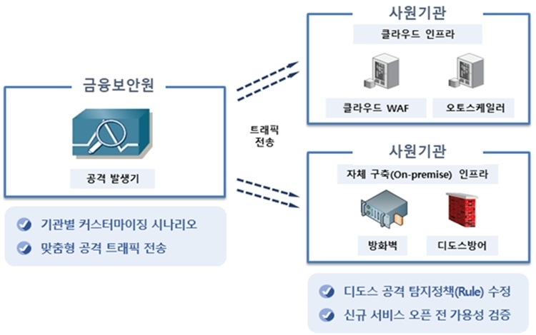 이번 테스트는 금융회사가 직접 구현하기 어려운 대용량 트래픽 환경을 제공해 성능 병목구간과 보안 허점을 미리 파악하는 정밀 진단 서비스다. 제한된 시간 내 복구 능력을 점검하는 기존 디도스(DDoS) 공격 대응훈련과 달리 기관별 구조를 반영한 맞춤형 검증을 진행하는 것이 특징이다.