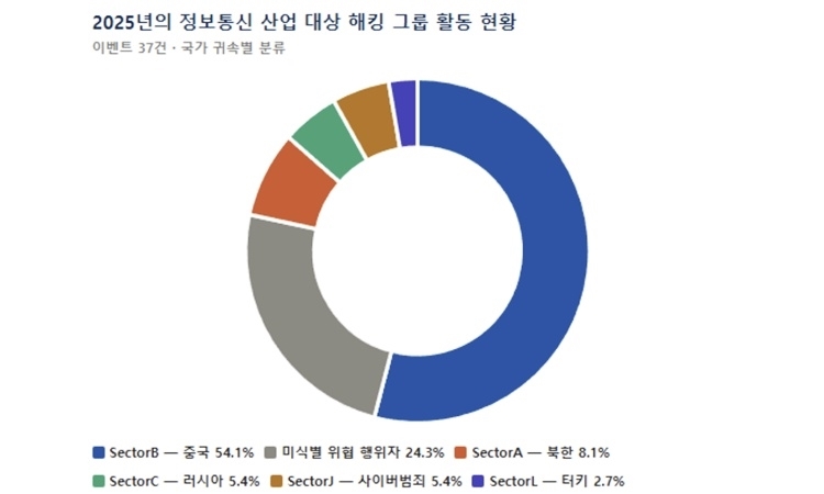 보고서에 따르면 지난해 정보통신 산업과 직접적으로 연관된 주요 침해 이벤트는 총 37건이 집계됐다. 공격에 관여한 위협 행위자는 총 22개 그룹으로, 이 중 중국 정부 지원 해킹 그룹으로 분류되는 SectorB 계열이 전체의 54.1%(20건)를 차지하며 가장 압도적인 활동량을 보였다. 이어 미식별 위협 행위자(24.3%), 북한계 SectorA(8.1%), 러시아계 SectorC(5.4%), 사이버 범죄 그룹(5.4%) 등이 뒤를 이었다.