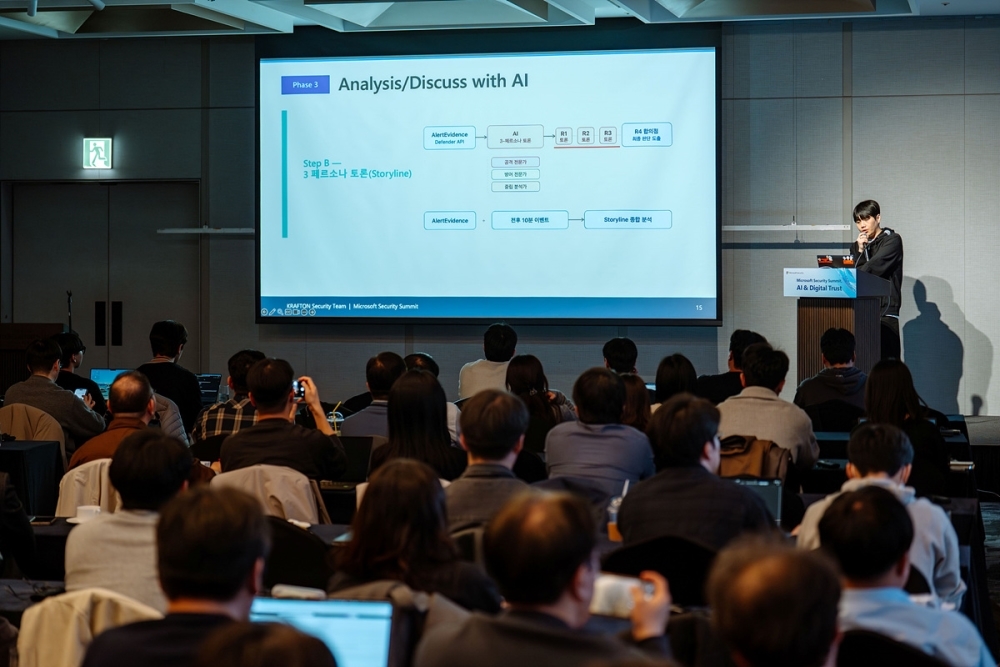 [보안뉴스 원병철 기자] 글로벌 게임 기업 크래프톤이 마이크로소프트 시큐리티 서밋(Microsoft Security Summit)에서 AI 기반 보안 운영(SecOps) 자동화 구축 사례를 공개했다. 이날 윤한상 크래프톤 보안 엔지니어는 대규모 사용자와 실시간 서비스 환경에서 요구되는 고도화된 보안 대응 체계를 확보하기 위해, Microsoft Defender XDR과 AI·자동화 기술을 결합한 보안 운영 모델을 단계적으로 구현했다고 밝혔다.