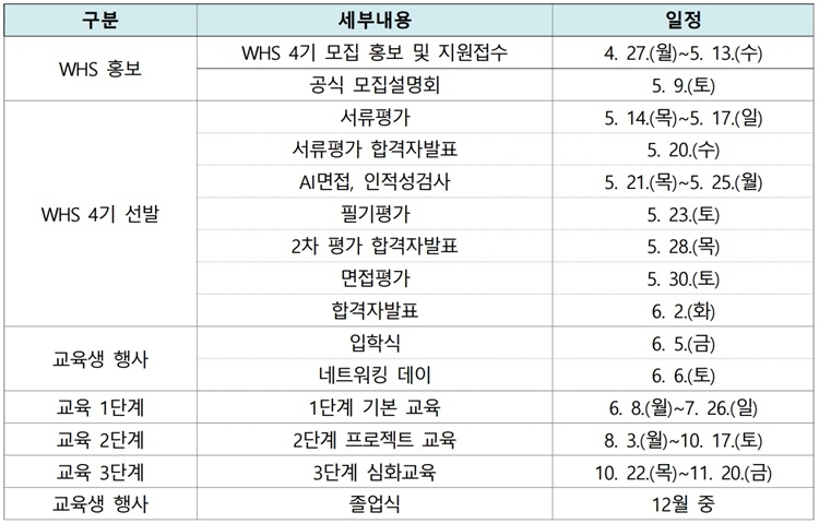 정보보호 공통 교육을 비롯해 취약점 분석, 침해 대응·디지털 포렌식·AI, 보안 운영·인프라·컨설팅, 개발 등 5개 핵심 분야로 커리큘럼을 구성했다. WHS 4기 모집은 27일 시작되며, 선발된 인원들은 단계별 프로젝트와 심화 교육을 진행한다.