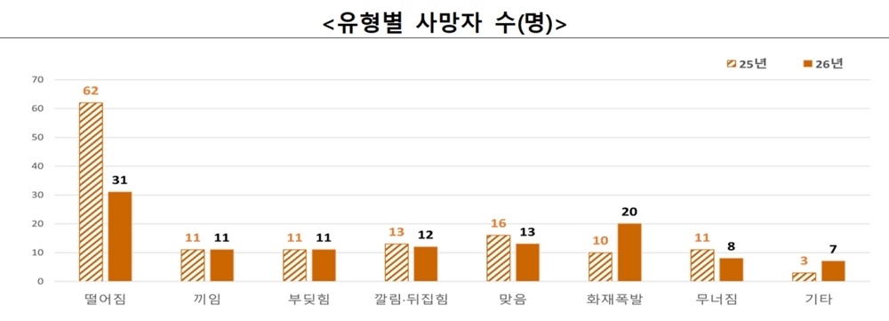 ‘떨어짐’ 사고가 전년 대비 절반 수준으로 줄어 31명 감소했으며, ‘물체에 맞음’(18.8%), ‘무너짐’(27.3%) 사고도 감소했다. 반면 화재·폭발 사고는 전년 대비 10명 증가했다.