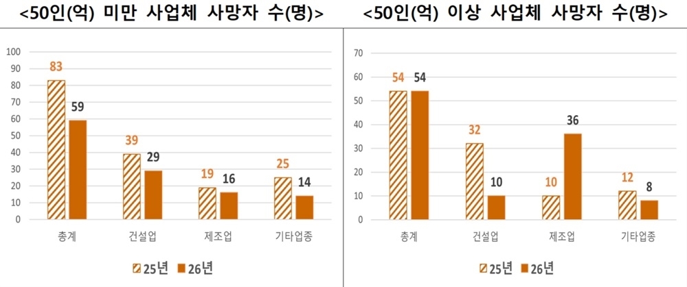 이에 따라 건설업은 5억원 미만 현장에서 전년 대비 9명(33.3%) 감소했으며, 50억원 이상 현장에서는 22명(68.8%) 감소했다. 기타업종 역시 5인 미만 사업장에서 9명(69.2%) 줄어 감소세가 두드러졌다.