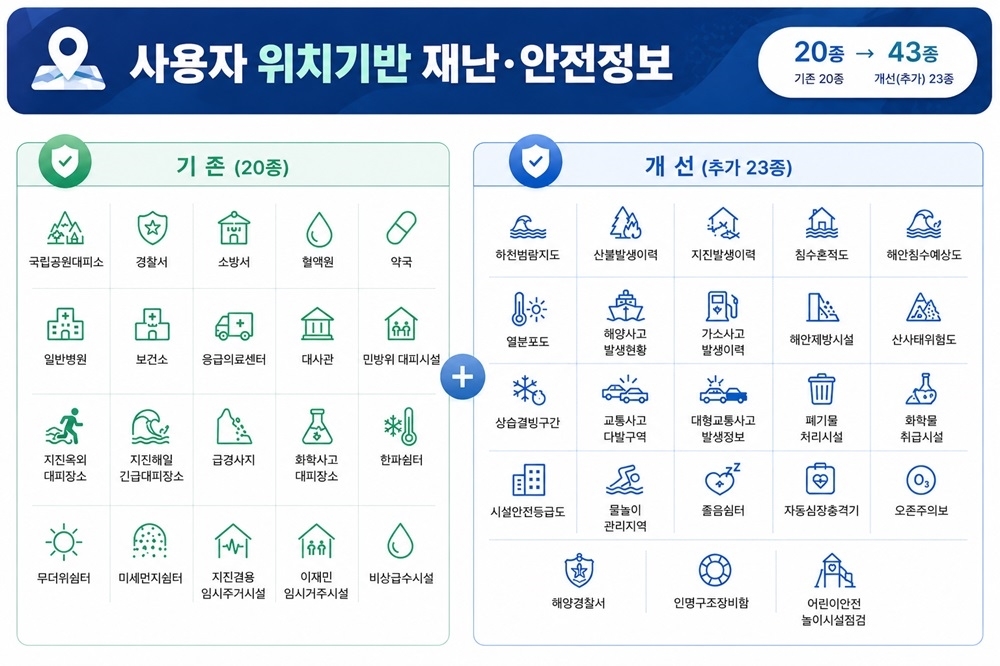 사용자 위치기반(지도)으로 확인할 수 있는 재난·안전정보도 기존 20종에서 43종으로 확대했다. 이에 따라 사용자가 관심위치를 설정하면 이를 기준으로 주변 재난·안전정보를 지도에서 쉽게 확인할 수 있다.