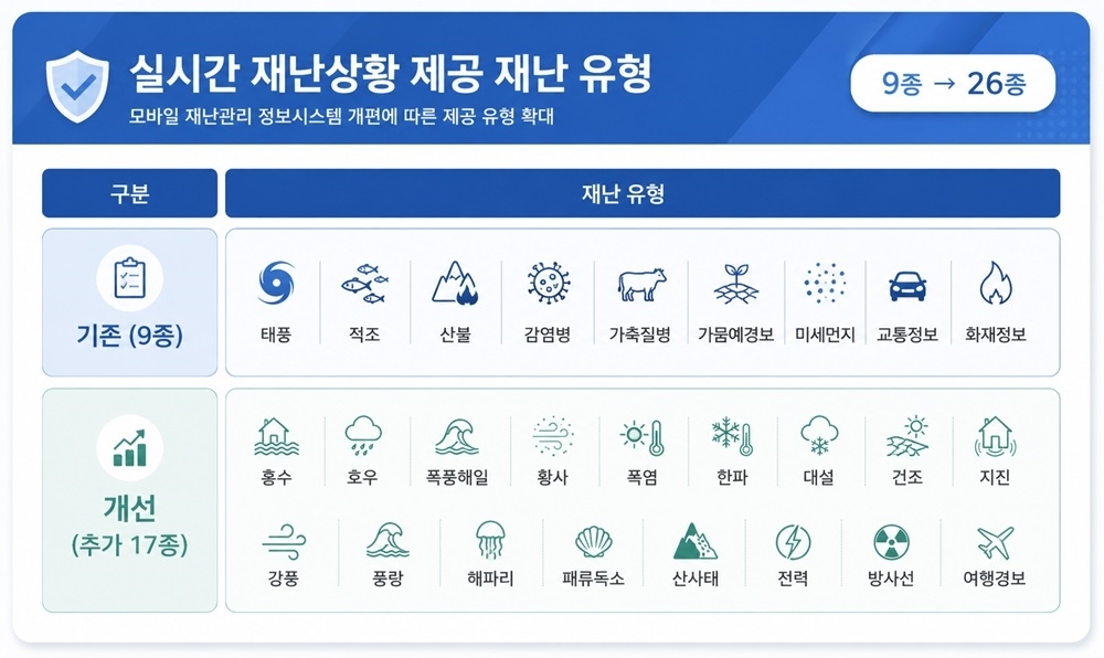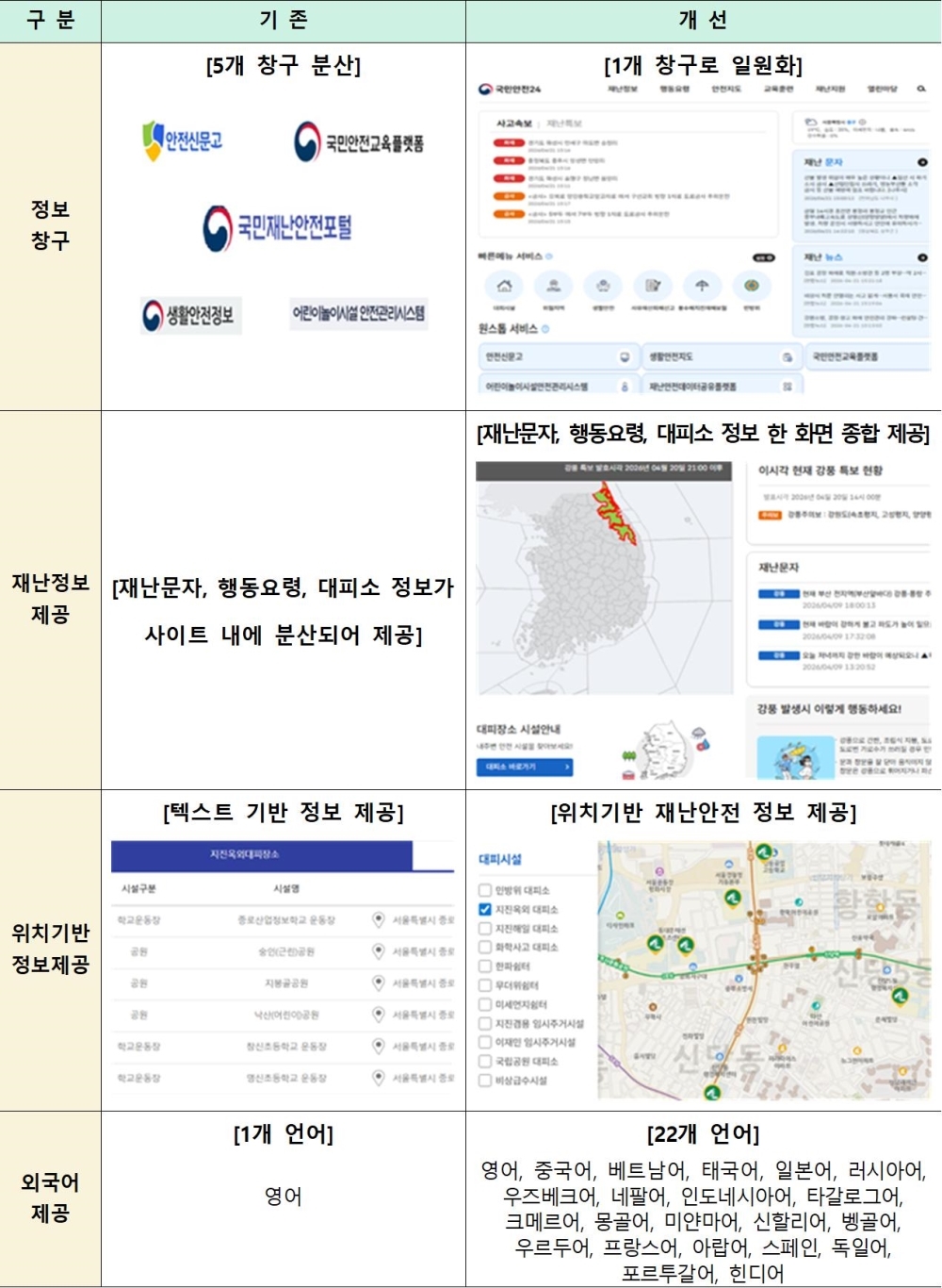 기상특보나 사고정보 등 실시간 재난상황 정보를 제공하는 재난 유형은 기존 9종에서 26종으로 확대된다. 특히 재난별 상황정보, 재난문자, 대피소 위치, 국민행동요령을 통합 안내함으로써 위기 상황에서 국민이 신속하게 대처할 수 있도록 돕는다.