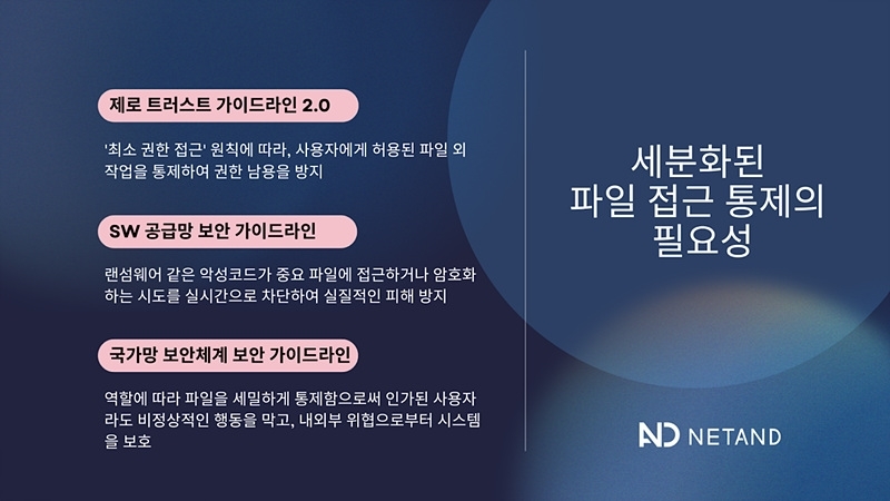 1. 제로트러스트 가이드라인 2.0: 제로 트러스트의 핵심 원칙 중 하나는 ‘최소 권한 접근’이다. 이는 사용자가 업무에 필요한 최소한의 권한만을 가져야 한다는 의미이다. 세분화된 파일 접근 통제는 이 원칙을 파일 단위까지 확장 적용하는 기술이다. 즉, 특정 서버에 접속할 권한이 있는 사용자라도 정책적으로 허용된 파일 외에는 읽기(READ), 쓰기(WRITE), 실행(EXECUTE) 등 어떠한 작업도 수행할 수 없도록 하여 권한 남용 및 오용의 위험을 원천적으로 제거한다.