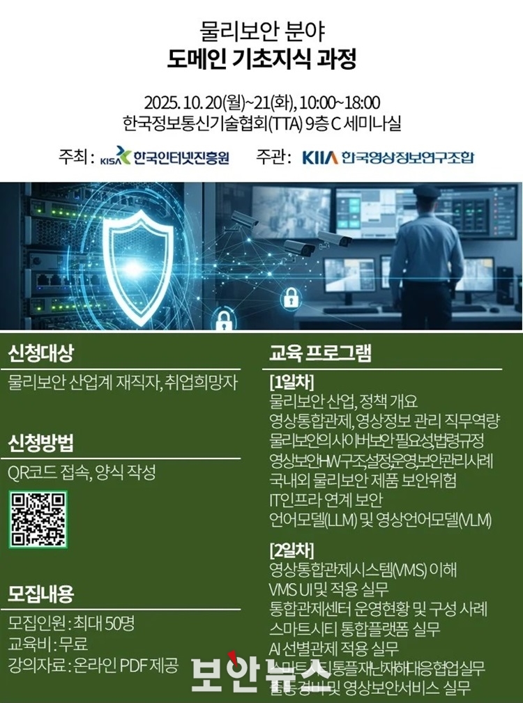 [보안뉴스 엄호식 기자] 한국영상정보연구조합(이사장 황정현, 이하 KIIA)은 한국인터넷진흥원(이하 KISA) 주관으로 오는 10월 20일과 21일 양일간 분당에 위치한 한국정보통신기술협회(TTA) 교육장에서 물리보안 산업체 재직자 및 관련 분야 취업 희망자를 위한 ‘물리보안 분야 도메인 기초지식 과정’ 교육을 진행한다고 밝혔다.