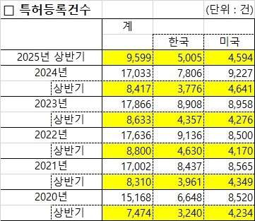 한국 내 특허 등록 건수가 5000건을 넘은 것도 이번이 처음이다. 삼성전자의 한미 특허 등록 건수는 2020년 상반기 7474건을 기록한 뒤 꾸준히 증가하는 추세다.