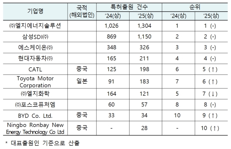 ▲국내 이차전지 관련 분야(일차전지 및 축전지 제조업) 다출원인 [자료: 지식재산처]