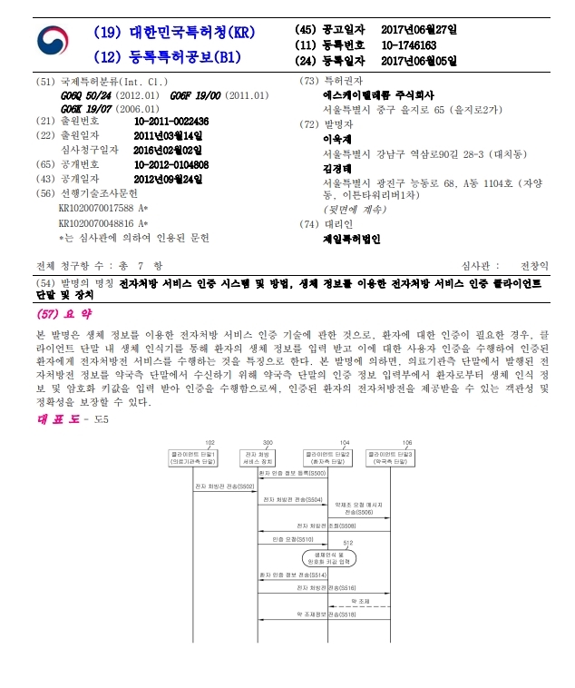 ▲‘생체 인증 기반 전자 처방 서비스 인증 시스템’ 특허 공보 [자료: IP전략연구소]