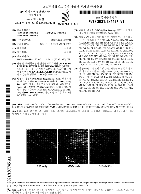 이 특허는 그동안 다양한 연구를 통해 신경 보호 및 재생 능력이 확인된 중간엽 줄기세포와 대사 조절 및 신경 기능 유지에 중요한 역할을 하는 인슐린을 결합한, CMT 치료 관련 신기술이다. 특허는 지난 2021년 국제(PCT) 출원된 이후, 지난해 유럽 특허청에도 기등록된 바 있다.