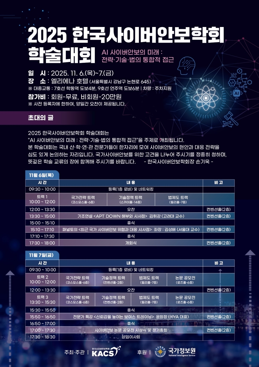 기술정책 트랙에서는 ETRI, KISTI, KAIST 등 연구 기관과 산업계 전문가들이 ‘AI 보안 및 주요 이슈’, ‘N2SF 1.0 구현 및 도입 전략’, ‘주요 해킹 사고 대응 방안’을 발표하며, 법제도 트랙에서는 윤상필(고려대)·장연화(인하대) 교수 등이 ‘민관협력 기반 사이버안보 패러다임의 구현 과제’와 ‘통신비밀의 보호와 법적 과제’를 다룬다.