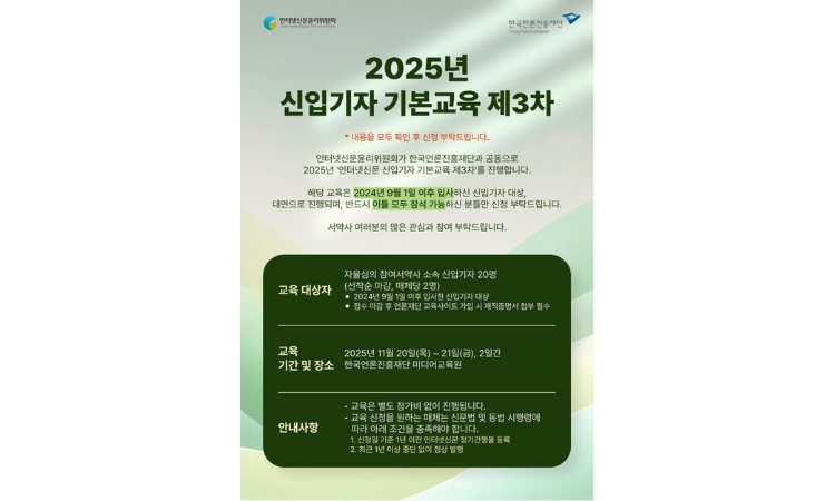 [보안뉴스 여이레 기자] 인터넷신문윤리위원회는 20-21일 이틀간 한국언론진흥재단 미디어교육원에서 ‘2025 인터넷신문 신입기자 기본교육’을 진행한다고 10일 밝혔다.