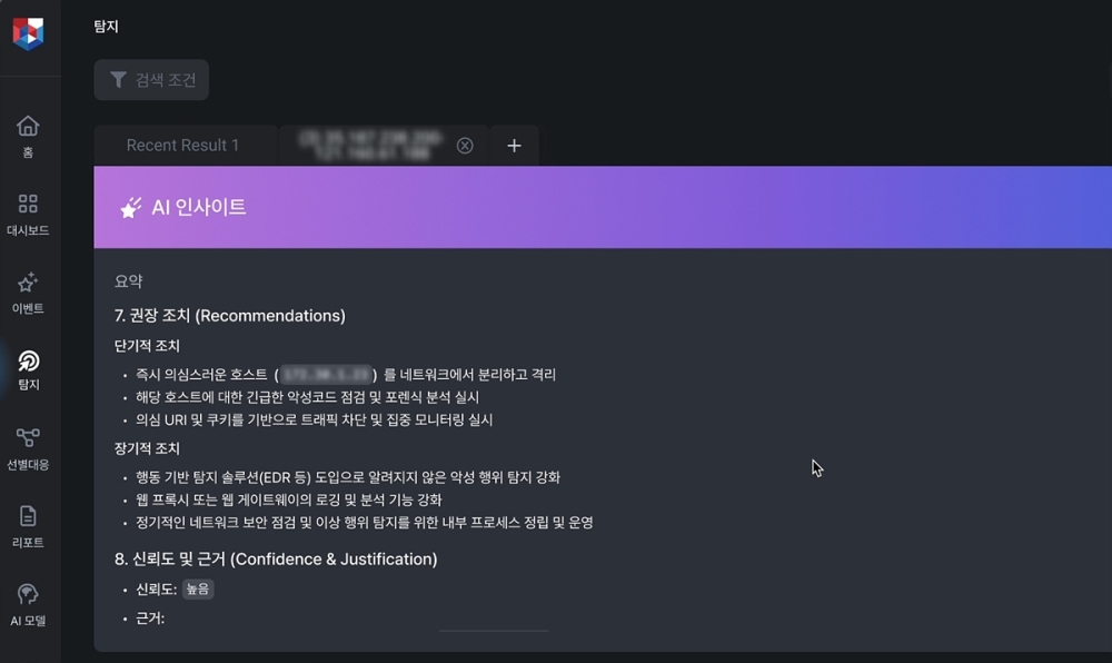 특히 증분(Incremental) 클러스터링 구조를 통해 모델 재학습 공백 없이 상시로 새로운 이상행위를 감지한다. 증분 클러스터링이란 초기 생성 모델에 신규 데이터를 반영하는 방식이다. 위협을 식별하는 동안 클러스터의 패턴을 인식해 클러스터별 정규표현식을 자동 생성하고, 실시간 데이터를 정규표현식으로 고속 비교한다. 자체 고속 클러스터링 알고리즘 특허 기술이 대용량 네트워크 트래픽에서도 분석 속도와 정확도를 확보한다. 이는 정부가 명시한 ‘상시 취약점 점검’과 ‘AI 기반 이상 탐지’ 정책의 기술적 실현 사례라 할 수 있다.
