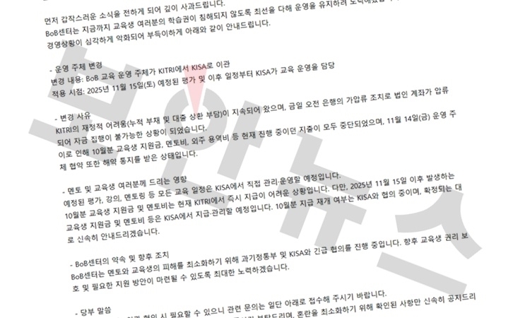 공지에 따르면, 15일 예정된 평가 및 이후 일정부터 KISA가 BoB 센터 교육 운영을 담당한다. KITRI 내부 사정으로 자금 집행이 불가능한 상황이기 때문이다. 10월분 교육생 지원금과 멘토비, 외주 용역비 등 현재 진행 중이던 지출이 모두 중단됐고, 14일부로 운영 주체 협약도 해약 통지를 받았다.