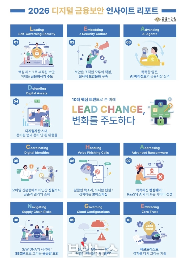 금융보안원은 ‘2026 디지털 금융보안 인사이트 리포트’를 발간했다고 17일 밝혔다. 2026년 디지털 금융보안의 10대 핵심 트렌드를 ‘변화를 주도하라’(LEAD CHANGE)는 키워드로 묶었다.