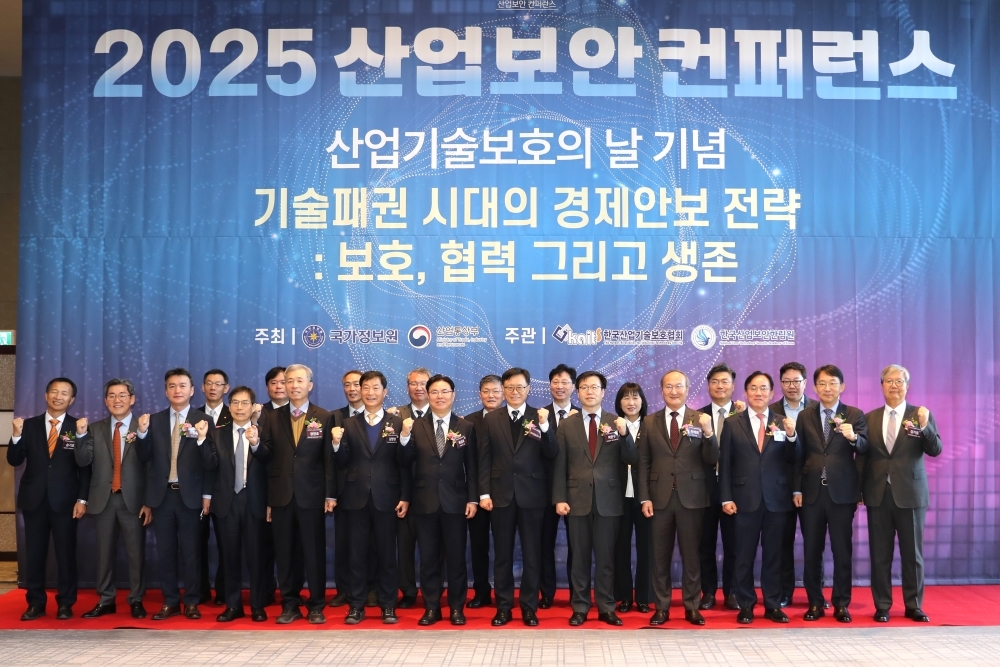 목성호 지식재산처 차장이 18일 오전 서울 삼성동 그랜드 인터컨티넨탈 서울 파르나스서 열린 ‘2025 산업보안 컨퍼런스’에 참석했다. 국가정보원과 산업통상부가 주최한 이번 행사는 ‘기술패권 시대의 경제안보 전략: 보호, 협력 그리고 생존’이라는 주제로 열렸다. 참석자들은 글로벌 기술 유출 대응 방안 및 첨단 보안기술 공유를 통해 산업보안 정책이 나아가야 할 방향 등을 모색했다. 목 차장(앞줄 왼쪽 7번째)이 개막식을 마치고 기념 촬영하고 있다.